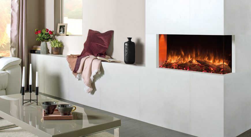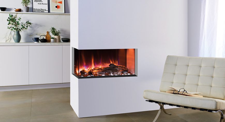 Caminetti elettrici installabili come camini trifacciali o come come camini ad angolo con vetro a sx o dx;