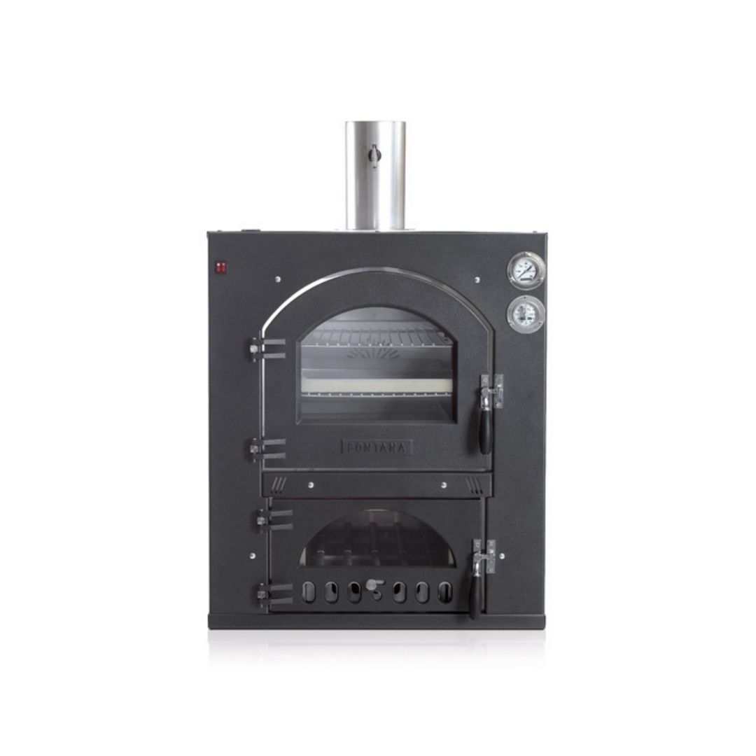 Tipo di combustibile: Legna Dimensioni esterne P 94 x L 74 x H 90 cm Dimensione camera di cottura: P 80 x L 45 x H 38,6 cm N pizze: 2 (il numero di pizze è considerato su un piano di cottura) Kg pane: 4-6 Numero coperti: fino a 12 Diametro canna fumaria: 150 mm Peso: 200Kg |