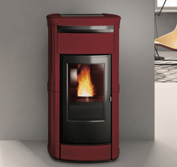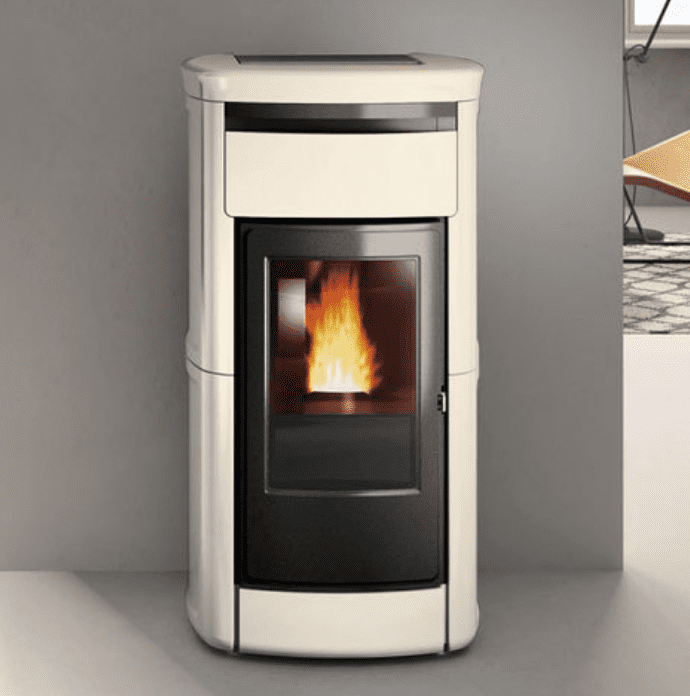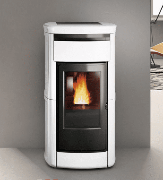 Termostufa a pellet con rivestimento in ceramica dal design classico che riscalda con l’acqua calda tutta la casa e produce anche aria calda per riscaldare il locale di installazione (disattivabile).