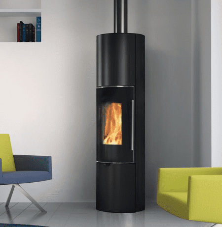 Stufa a legna Tally GL Evo2, con ampio vetro tondo che esalta la visione della fiamma. Tally GL Evo2 è predisposta per accumulo con kit optional: il top con anelli refrattari consente di accumulare calore e rilasciarlo in maniera prolungata anche nelle ore successive all’ultima carica di legna.