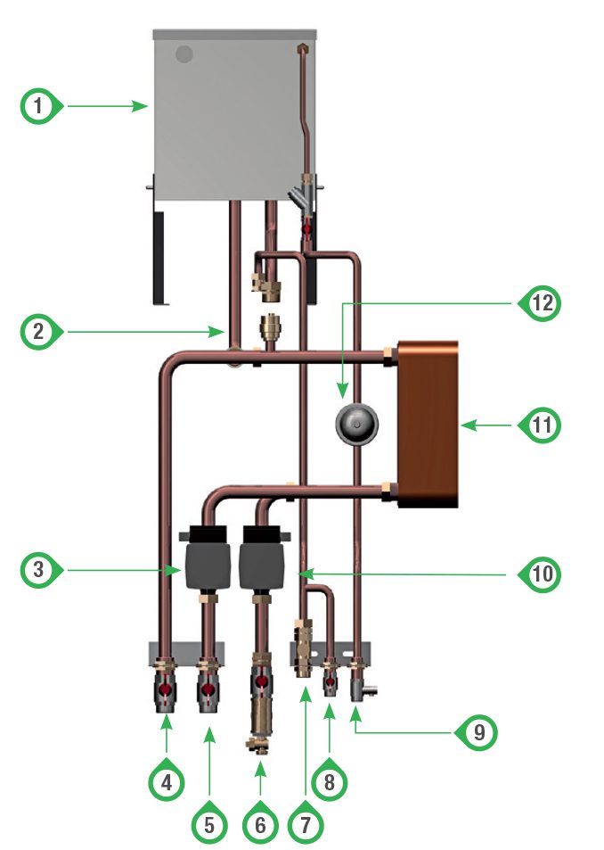 11 – Scambiatore a piastre con scambio termico in controcorrente idoneamente dimensionato a seconda della potenzialità del termocamino