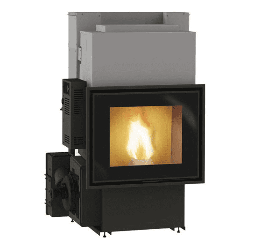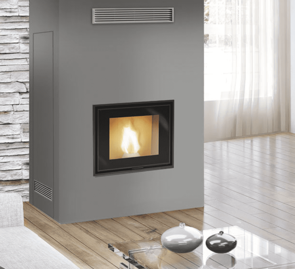 Caminetto a pellet in grado di riscaldare l’acqua per alimentare l’impianto di riscaldamento (termosifoni, scalda salviette, pannelli radianti a pavimento..). Tramite un apposito kit optional, è possibile attivare la ventilazione aria calda frontale (modulabile e disattivabile) per riscaldare il locale dove è installato.